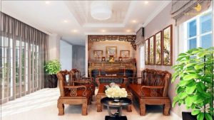 Mẫu thiết kế nội thất phòng khách có bàn thờ đẹp, sang trọng