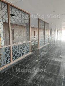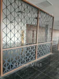 - Vách ngăn CNC, vách trang trí: Sử dụng các tấm inox mạ PVD cắt hoa văn tinh xảo, phân chia không gian một cách nghệ thuật.